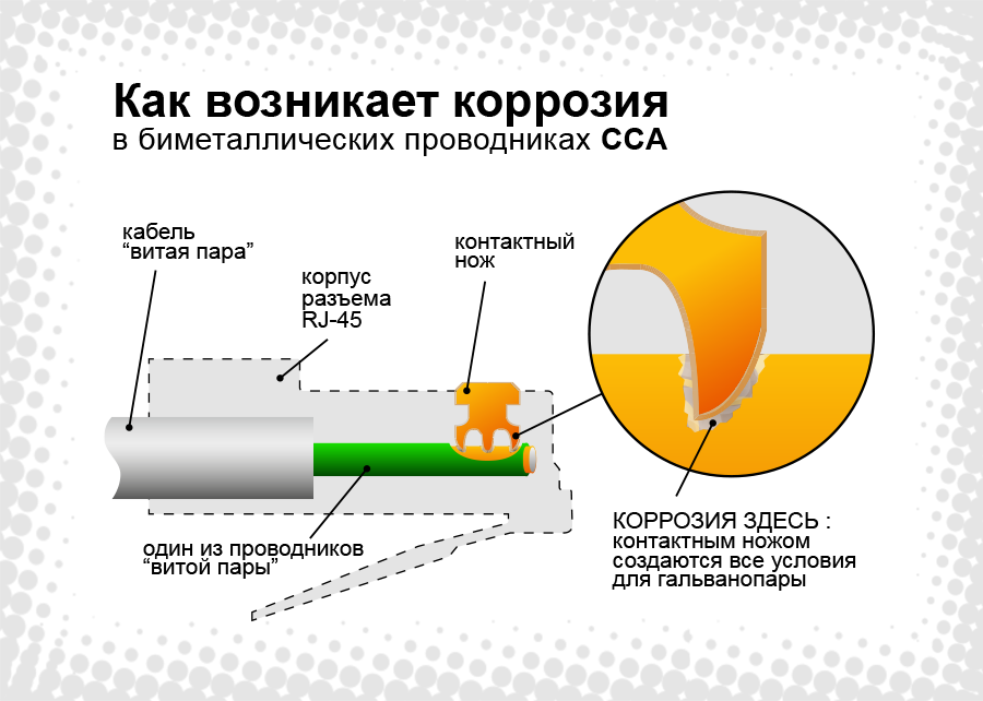 Риск возникновения коррозии из-за разрушения тонкого слоя меди при заделке "витой пары" в разъемВажно понимать, что при установке стандартных разъемов типа RJ-45 на вот такие "алюминиевые" CCA-проводники в контактных группах в условиях влажной среды, например, при подключении наружной IP-камеры, Wi-Fi-роутера в чердачном помещении и т.д., в разъеме будет развиваться коррозия, которая рано или поздно приведет к потере сигнала.